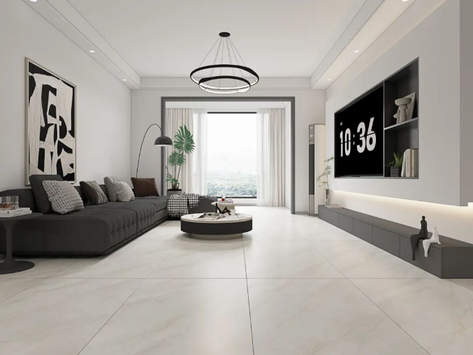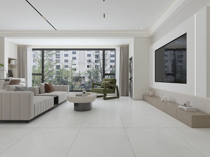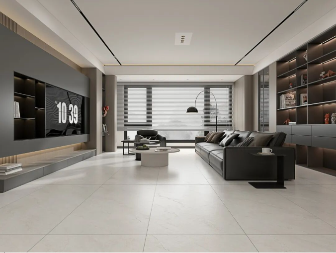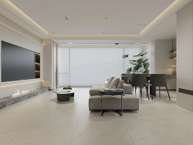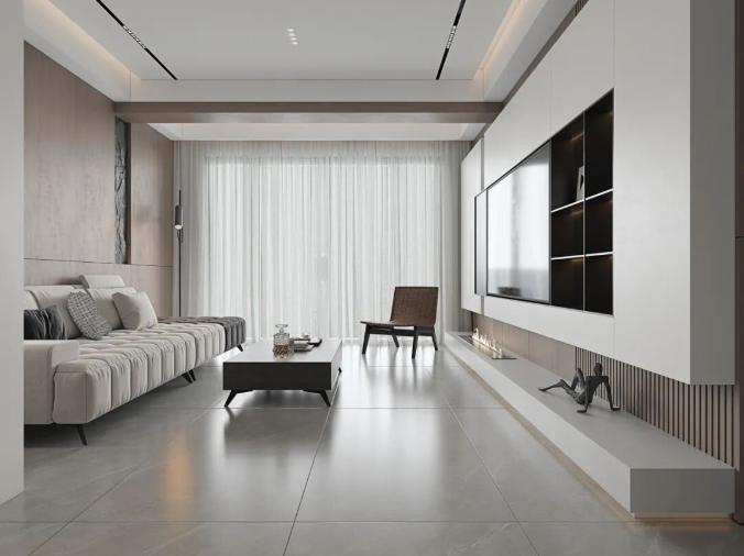 通过中性色、大规格、自然纹理奠定空间基调,结合开放式布局与极简家具,形成“简于形,精于质”的现代生活美学。